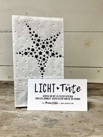 Zum Schmücken Ihrer Wohnung oder als kleines Geschenk. Material: Papiertüte weiß, Größe: ca. 9 x 16 x 5 cm. Nur mit LED-Teelicht betreiben! Der schwarze Tonkarton ist nur für die bessere Erkennbarkeit des Motivs, ist nicht in der Tüte enthalten. KEIN VERSAND!